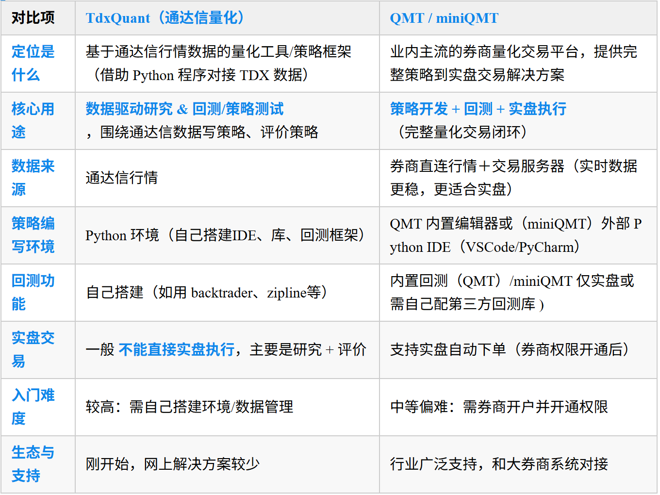 TdxQuant(通达信)和miniQMT怎么选,做了一个两者对比表格,可参考。