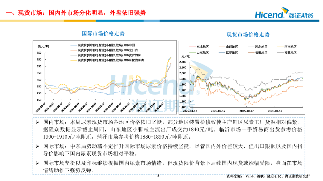 本周尿素主力合约移仓至09合约,盘面企稳反弹,价格重心环比上移,周内表现坚挺。截止周四收盘,UR2609合约价格报收于1916元/吨。