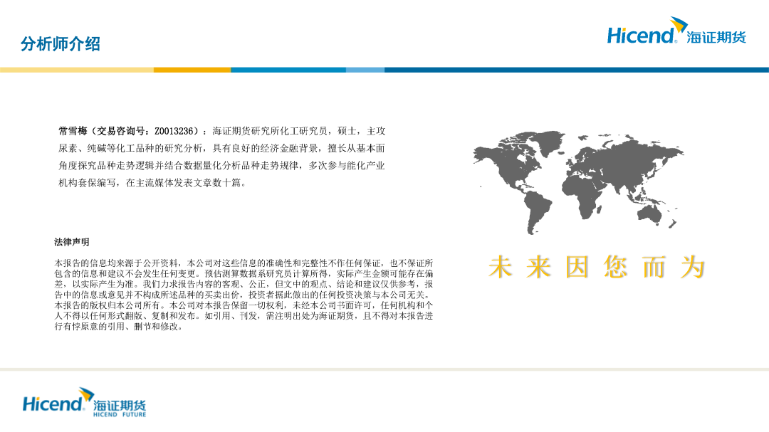 常雪梅(交易咨询号:Z0013236):海证期货研究所化工研究员,硕士,主攻尿素、纯碱等化工品种的研究分析,具有良好的经济金融背景,擅长从基本面角度探究品种走势逻辑并结合数据量化分析品种走势规律,多次参与能化产业机构套保编写,在主流媒体发表文章数十篇。