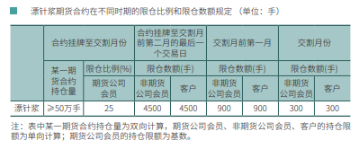 期货公司会员、非期货公司会员和客户的漂针浆期货合约在不同时期的限仓 比例和持仓限额具体规定如下: