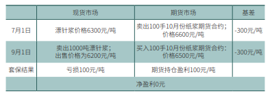 案例:7月份,某纸浆贸易商了解到现货市场漂针浆售价为6300元/吨,并对 此价格比较满意,因此加紧备货;但因为担心市场过度供给导致价格下跌,利润 减小,该贸易商决定通过纸浆期货的卖出套期保值交易锁定利润: