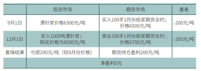 案例:9月份,某造纸企业计划在12月份购入一批纸浆,但预期纸浆价格将 在未来3个月内呈上涨趋势,为了规避3个月内原料价格波动的风险,该造纸企业 决定通过纸浆期货进行买入套期保值交易预防价格不利变动的影响: