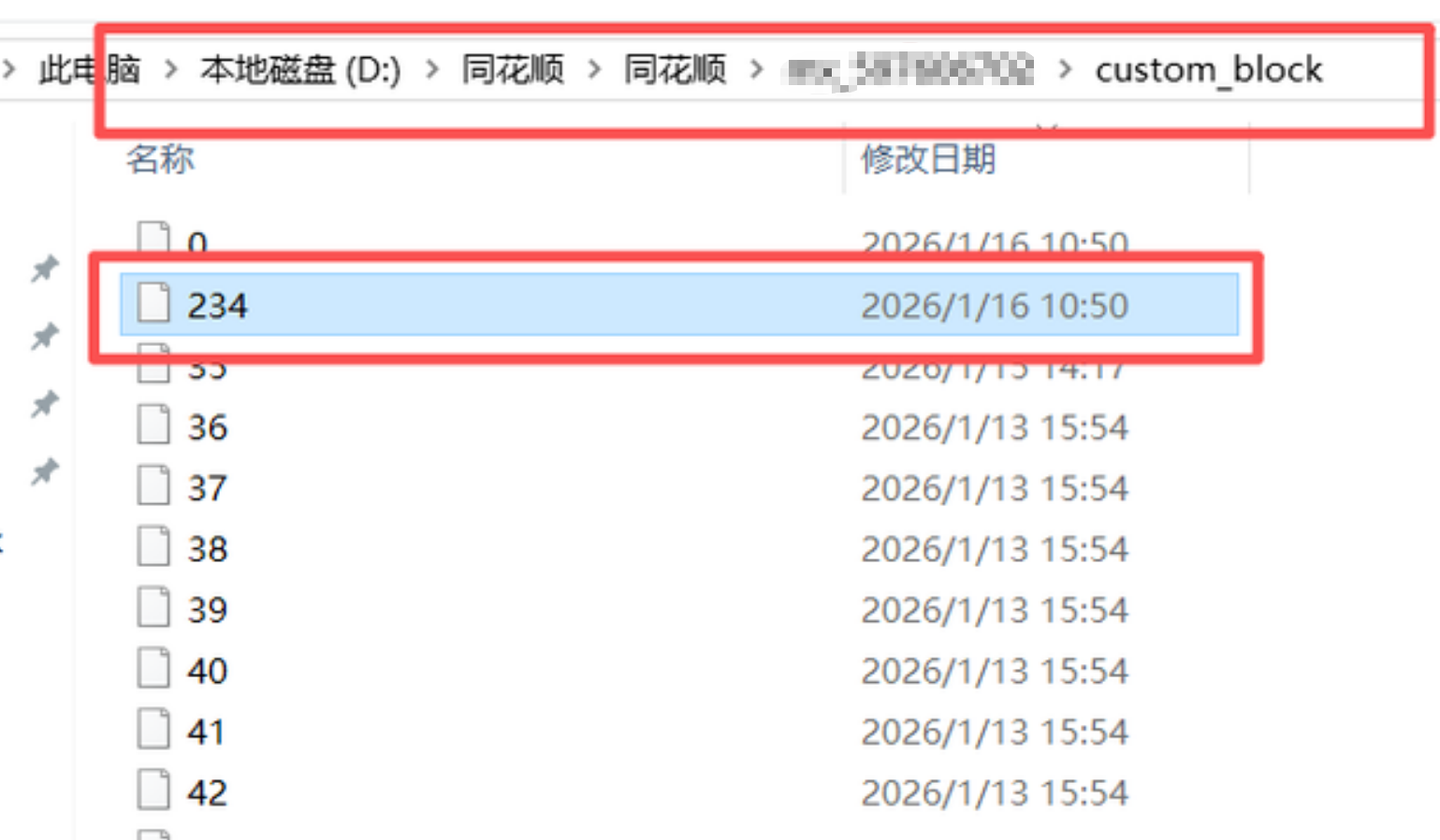 然后进入以你同花顺登录账号命名的文件夹,不同账号名称不同,打开custom_block文件夹,找到对应自选股板块的文件编码,我这里就是234,找到自选股位置后复制自选股所在的路径;不确定自选股位置的,可以随便在同花顺自定义股票池里面修改里面的股票看修改时间就可以确认是那个那个板块的编码。