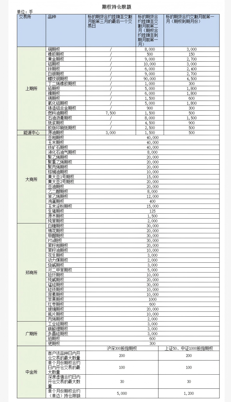 四大期货交易所,各个品种期权持仓限额......