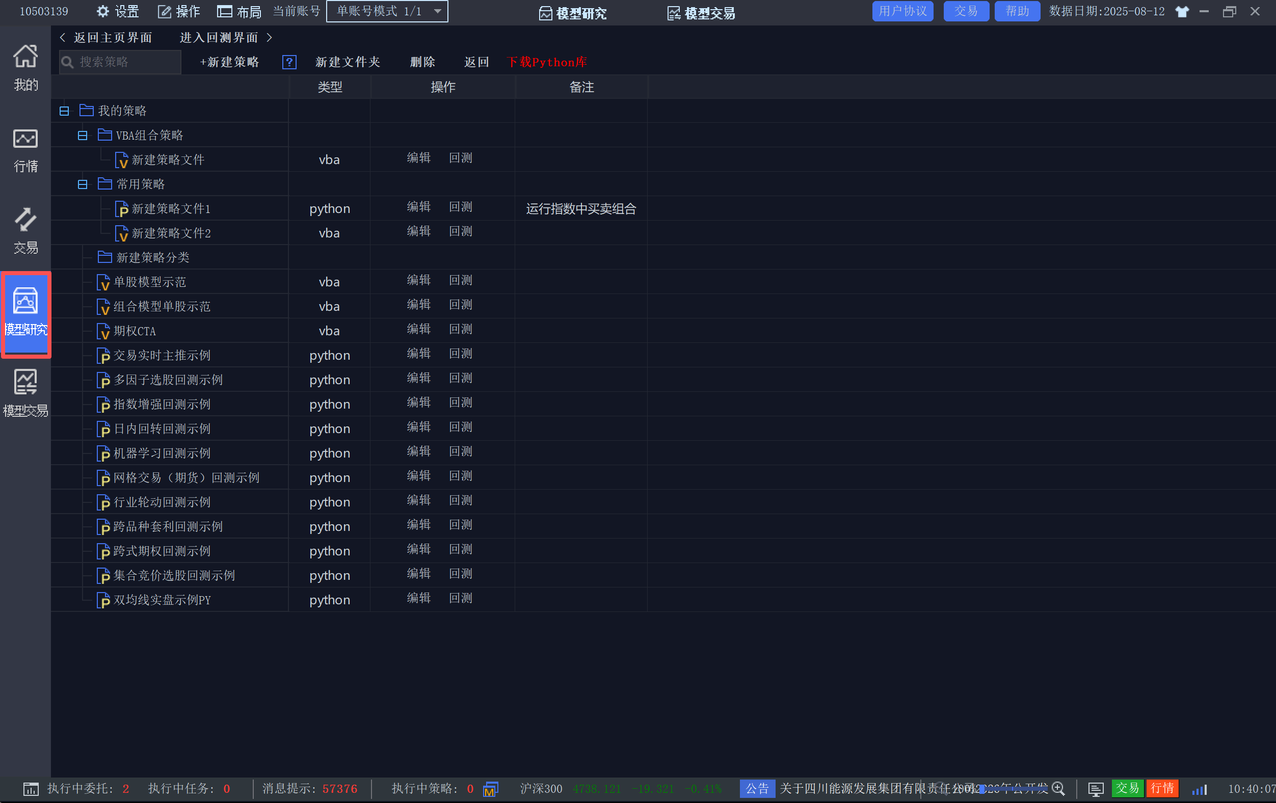 “模型研究”是QMT的核心研发模块,你可以在这里创建、编写和回测你的交易策略。