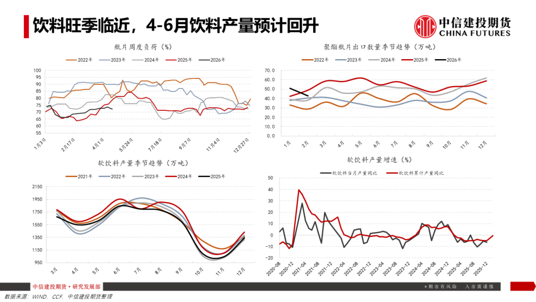 PR:总体看,瓶片基本面相对偏强。供应端,瓶片行业负荷仍处于历年同期低位,部分前期长停或延期投产的装置存在重启或投产的可能。3月中旬起,瓶片供给端表现较为强势。部分主流大厂因前期超卖压力较大,通过发布延迟履约公告等方式缩减合约量,叠加出口订单跟涨补货,导致流通货源持续紧张、现货基差强势。瓶片价格随上游原料走强,加工差再次修复,预计将维持在五年同期高位。需求端,终端市场正值采购旺季,但高位原料使得终端价格传导受阻,国内部分下游企业或被迫停车;海外需求较好,出口跟进,预计将对需求形成提振。综合来看,短期成本端支撑仍存,PR 6月期价在7700-8500核心区间震荡运行。