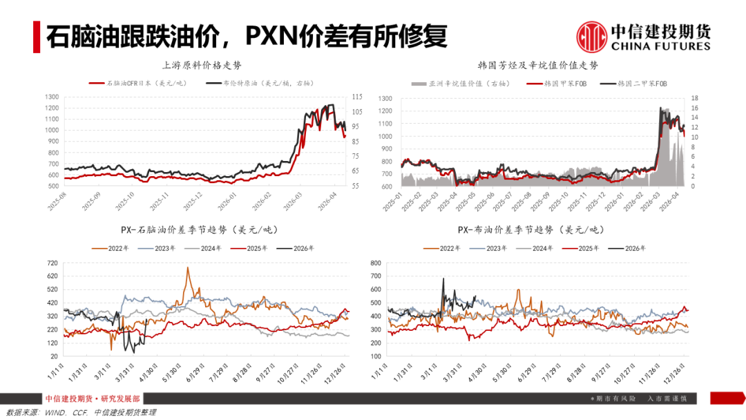 PX:总体看,本周PX供需面边际转弱。利润方面,受PX装置提前检修消息及套利窗口打开影响,PX逆原油偏强运行;同时,由于市场对霍尔木兹海峡恢复通航的预期升温,中东地区石脑油和LNG的供应前景有所改善,石脑油价格偏弱,PXN大幅修复,PX-MX价差亦修复至五年同期高位。供应端,受中东化工原料进口受阻影响,部分装置减产,本期亚洲炼厂减产降负范围有所扩大。国内方面,随着封锁前最后一批海上货源到港,因原料问题导致的PX装置计划外变动开始显现。目前处于传统检修季,部分原本计划下半年检修的装置开始提前检修,但现货供应并不紧张,需关注4月底后的风险。即使未来美伊谈判结果向好、霍尔木兹海峡恢复通航,船公司仍需6至8周恢复期,在此期间原料端的不可抗力影响仍将持续。随着时间推移,原料库存逐步消耗,4月底后供应端收缩风险将明显上升。需求端,4月PTA计划外检修预计增多,但更多将伴随PX大厂检修一同进行或延期进行,对PX需求形成的阶段性压制有限。PX基本面在产业链中相对偏强。随着PX装置检修季开始,3月起库存从累库转为去库,去库格局将至少延续至二季度。