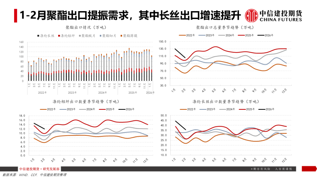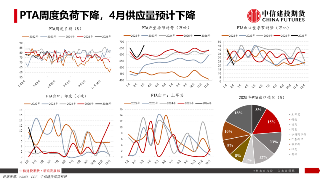 PTA:总体看,本周PTA供需面边际改善。供应端,本期恒力停车检修,PTA行业负荷显著下降,但仍处于历年同期中性水平。短期来看,由于上游PX环节仍保有原料库存、现货供应尚不紧张,PTA未因原料问题出现计划外降负。 本周仓单由流出转为流入并升至高位,聚酯工厂和贸易商补货动作增加,但伴随个别主流供应商出货,现货基差先涨后跌,后期现货流通性偏紧的概率仍存,需关注4月底后的传导风险。 即使未来美伊谈判结果向好、霍尔木兹海峡恢复通航,船公司仍需6至8周恢复期,在此期间原料端的不可抗力影响仍将持续。随着上游原料库存逐步消耗,4月底后PX环节供应收缩风险上升,届时将逐步传导至PTA环节,计划外降负或停车的装置预计增多,PTA供需格局有望好转。需求端,由于地缘局势出现变化,部分原本按新价格洽谈的订单目前已被暂时搁置。在地缘局势明朗前,市场接货心态仍偏谨慎,终端工厂开工预期维持稳定。4月中下旬,随着终端原料消耗殆尽,下游跟进力度有望增加。尽管偏高的成本向下传导缓慢,但下游终究需要补货,聚酯负反馈短期内难以显著显现,减产幅度有限。上游降负将早于下游,聚酯环节利润在减产作用下逐步向下游传导,产业链利润传导较为健康。