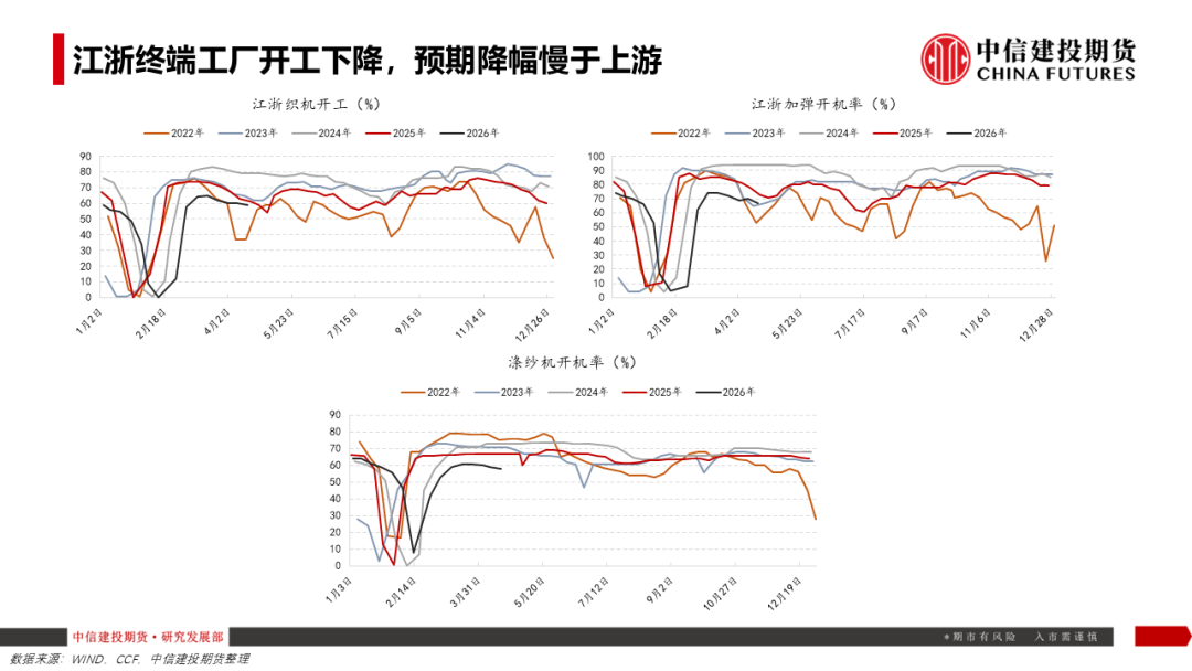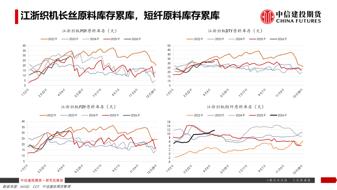 PF:总体看,短纤基本面偏弱。供应方面,短纤行业开工率处于历年同期偏高水平,后期部分工厂存减产计划。在地缘局势反复变化的背景下,市场整体成交偏弱,短纤价格较难跟上上游原料涨幅,加工差被压缩。需求方面,终端订单不足,部分秋冬订单签订延期,下游按单生产,预计以刚需补库为主。纱厂负荷延续逆季节性降负态势,处于五年同期低位,临近五一假期,部分纱企已有减产计划。综合来看,短期成本端支撑仍存,预计PF 6月期价将跟随原料价格,在7800-8300核心区间震荡运行。