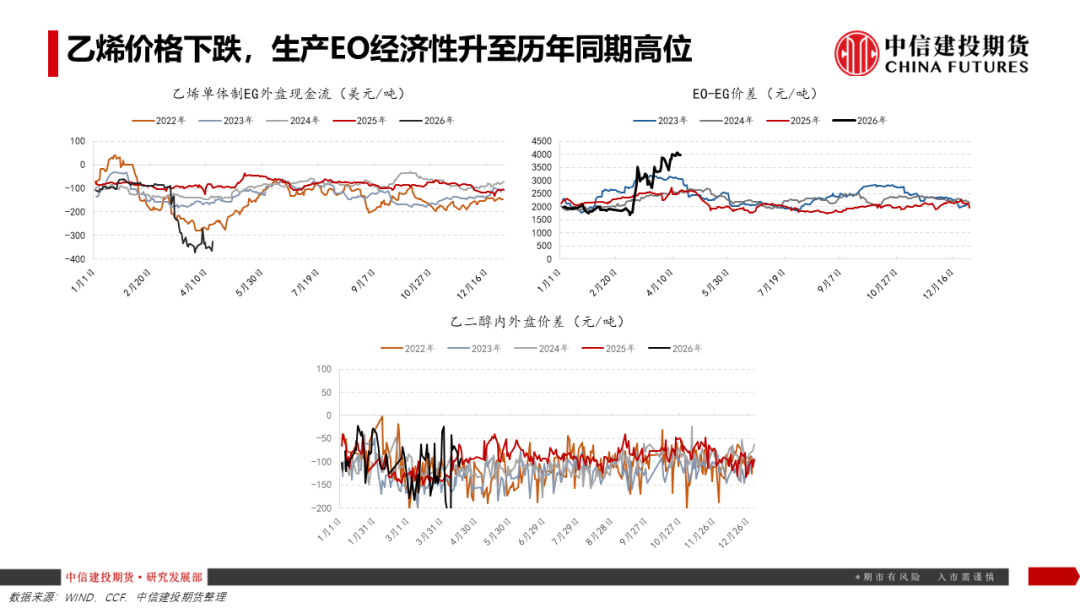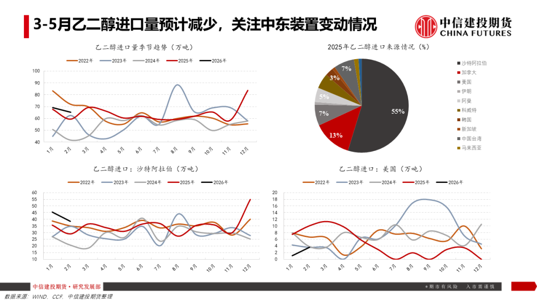 EG:总体看,本周乙二醇供需面变动不大。市场此前已预计,因霍尔木兹海峡未能通航,乙二醇进口将显著缩量;而朱拜勒工业区袭击进一步加剧了市场担忧情绪。目前来看,沙特Sharq两套装置再次关停,遇袭后装置恢复进展预计将推迟更久。海外多套装置因不可抗力出现计划外检修,中东进口运输受阻,即使国内合成气制装置提负,也较难弥补进口的损失量。此外,3月下旬起,乙二醇出口询盘显著增多,来自印度、韩国的买家抢出口意愿增强;同时,印度6月前免征乙二醇进口关税的消息也进一步强化了出口增多的预期。国内供应方面,虽然部分合成气制装置仍存春季检修及催化剂更换计划,但受油制装置提负影响,乙二醇行业整体负荷仍处于历年同期高位。国内缺油的时间晚于海外,短期内国内整体负荷降幅有限。同时,相较于油制路线,合成气制乙二醇的成本优势正逐步显现,其利润已随价格走高而大幅修复至五年同期高位,预计检修结束后装置提负生产的概率较大。需求端,新订单整体偏弱,除赶工出口和应急订单外,其他订单普遍处于观望状态,部分终端工厂在五一前后存在降负计划。尽管偏高的成本向下传导缓慢,但下游终究需要补货,聚酯负反馈短期内难以显著显现,减产幅度有限。上游降负将早于下游,聚酯环节利润在减产作用下逐步向下游传导,产业链利润传导较为健康。库存方面,4月乙二醇库存去库幅度扩大,去库格局将至少延续至二季度。综合来看,即使霍尔木兹海峡恢复运行,乙二醇进口缩量短期内仍较难弥补,供应端显著缩量将对乙二醇价格形成支撑。预计乙二醇9月期价在4600-5200核心区间震荡运行。