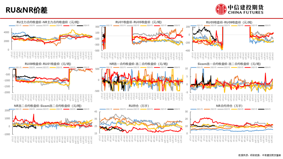 逻辑:近期,在国内云南海南与越南产区出现了明显的高温少雨天气,引发了市场对于未来供应的担忧,而从目前的气象数据来看,泰国、印尼、科特迪瓦等全球主产区(三者合计占比65%)尽管同样出现高温天气,但是降雨量并未出现显著异常,降雨量目前仍未低于2024年同期,均温也未高于2024年同期(2024年的天气条件相对极端),故目前的天气条件或至少优于2024年同期,因此预计天气问题对供应端的冲击弱于2024年。需求端,近期下游库存小幅走高,或体现需求的阶段性放缓。因此,随着天气担忧褪去,RU&NR迎来回落。向后看,短期内平衡表的矛盾或相对有限,RU&NR震荡运行。