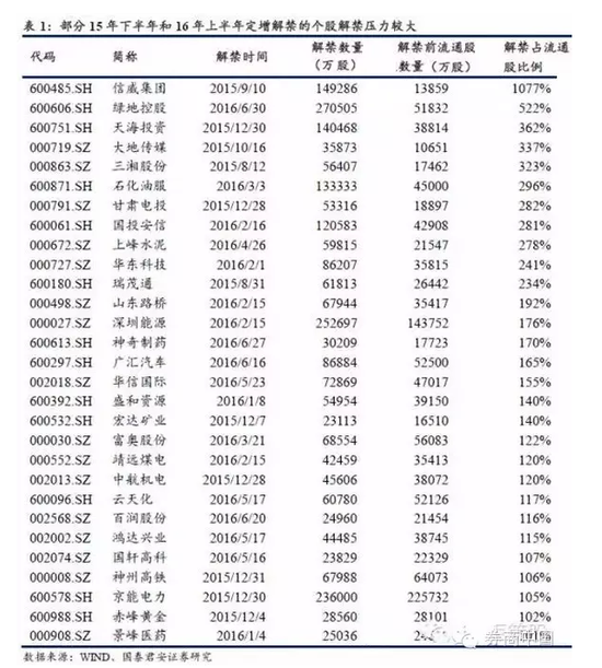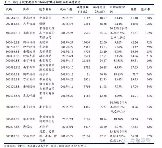 国泰君安(24.000, 0.24, 1.01%)证券研究所还称,“不减持”禁令将解,部分个股的重要股东(持股5%以上)存减持动力。2015年上半年的牛市过程中,大股东、董监高及产业资本出现了一波减持潮,“不减持”禁令以及证监会维稳“五选一”方案出台后,大股东、董监高及持股5%以上的重要股东禁止减持,同时要求积极地增持。目前已有部分个股在“不减持”禁令前三个月有重要股东(持股5%以上)减持且目前股价相较于之前减持时股价的溢价率超过50%,禁令解除后,这些重要股东存减持动力。
