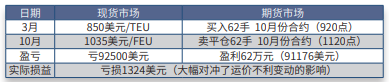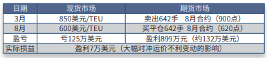 虽然现货市场运价下跌,该班轮公司减少了运费收入,但是期货市场交易盈 利大幅对冲了运价下跌带来的不利影响。