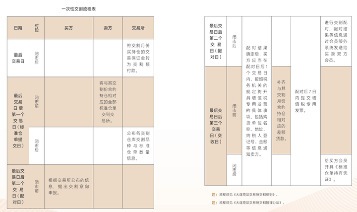 一次性交割是指在合约最后交易日后,交易所组织所有未平仓合约持有者进行交割的交割方式。一次性交割在了个交易日完成,分别为标准仓单提交日、配对日和交收日(最后交割日)。在合约最后交易日后,所有未平仓合约的持有者须以交割履约,同一客户号买卖持仓相对应部分的持仓视为自动平仓,不予办理交割,平仓价按一次性交割的交割结算价计算。
