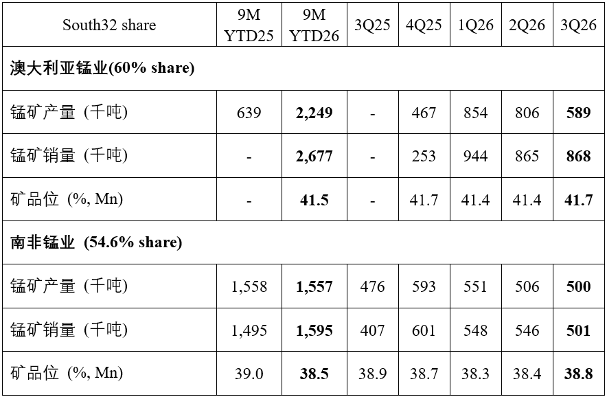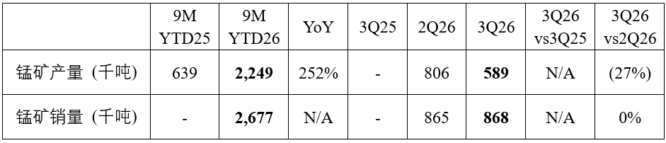 2025年12月和2026年3月季度维护工作完成, 2026财年前三季度锰矿产量同比基本不变为1,557千吨,2026财年产量目标保持不变仍为2,000千吨。