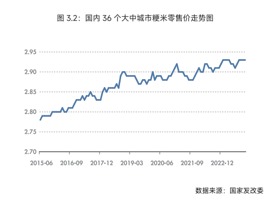 从历年生产情况看,农业政策、种植结构调整、科技进步、气候等宏观因素对粳稻种植面积和产量影响均较大,相应可引起粳米供应变动。2013 年以来,我国粳米需求增速放缓,而粳稻产量逐年增加粳稻米市场供大于求状况逐渐显现。此外,从中微观角度来看,稻谷的库存变化、储备稻谷的轮换、托市量出库销售的数量和价格也影响稻谷的供给量从而影响大米的供应量。