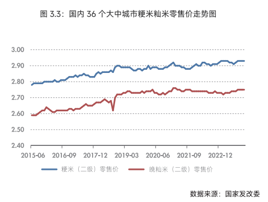 粳米与籼米及其他主食在消费上可以替代,因此,粳米与籼米及其他主食的比价关系会影响粳米的供需、产销,导致其价格发生变化。其中,粳米与中晚籼米、面粉、玉米之间的比价关系最为重要,这些替代品的产量、价格及消费量的变化对粳米价格将产生直接或间接的影响。一般情况下,替代商品之间互为竞争关系,某商品价格上涨,消费者转而购买其替代品,引起替代品需求增加,价格上涨。