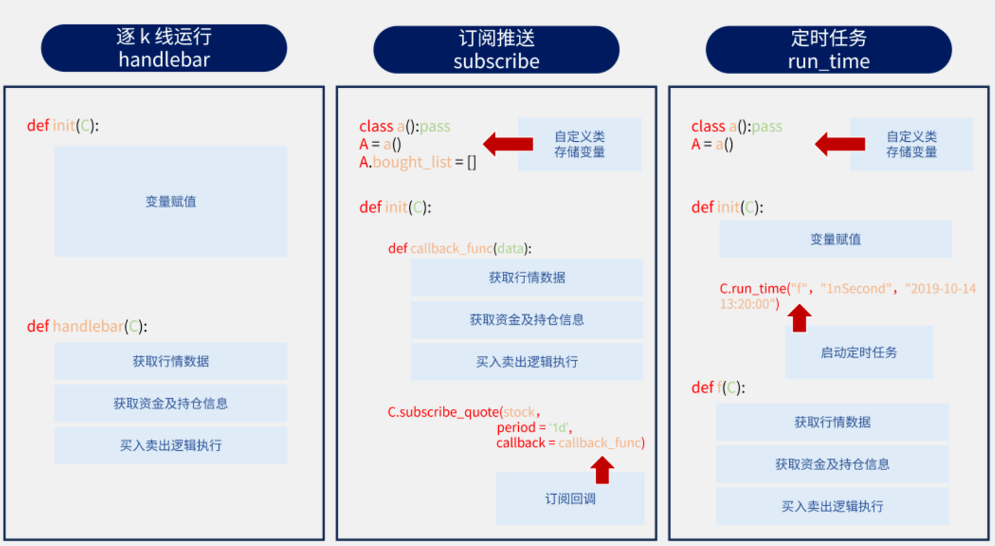 QMT 系统提供两大类(事件驱动与定时任务),共三种运行机制。
