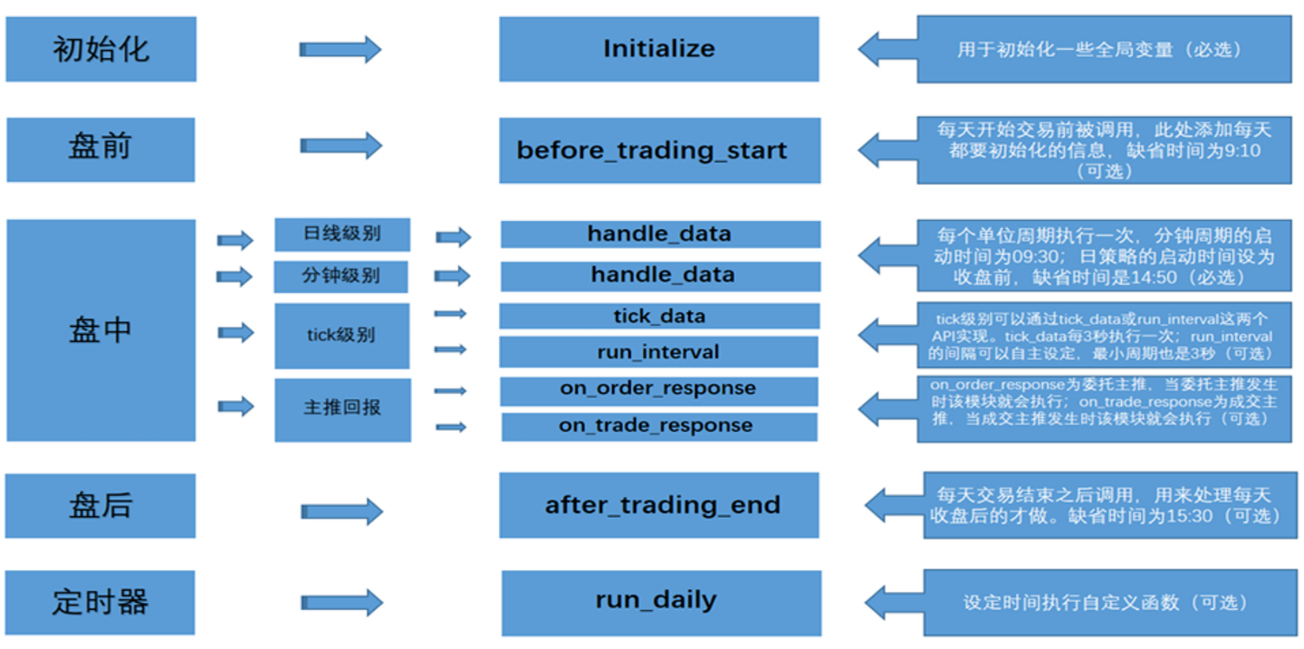 ptrade 量化引擎以事件触发为基础,通过初始化事件、盘前事件、盘中事件、盘后事件来完成每个交易日的策略任务。