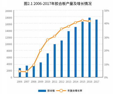 我国自2003年胶合板产量超过美国后,一直成为世界胶合板第一生产大国。2017年,胶合板产量为1.71亿立方米,是2006年的6.3倍, 年均复合增长率为20.21%。