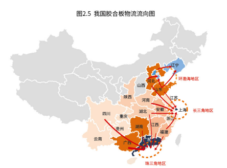 我国胶合板贸易分布及物流流向比较明晰,基本避循由内陆主产区流向环渤海、长三角以及珠三角区域。根据国家统计局测算,胶合板流出量较大的省份包括山东、河北、湖南、广西、安徽等地;供需缺口最大的是广东省,其次为北京、上海、 辽宁,其余绝大部分省份基本处于供需平衡状态。