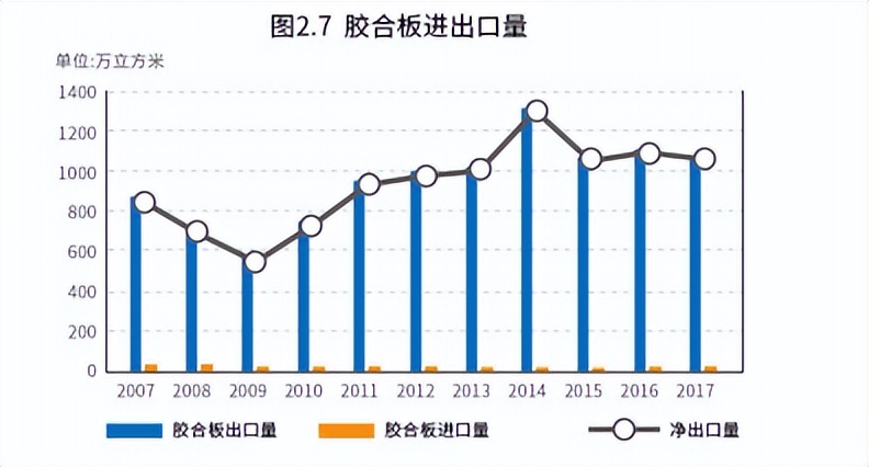 从国际贸易看,我国胶合板长期保持净出口状态,2017年胶合板进口量约18.55万立方米,而出口量达到了1083.54万立方米,贸易顺差1064.99万立方米。