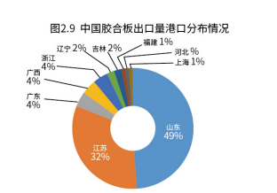 2017年我国胶合板的主要出口国有:美国、菲律宾、阿联酋、日本和英国等,分别占我国胶合板出口总量的14.81%、8.24%、 6.29%、 6.23%、5.87%。从国内出口港分布看,超过70%的胶合板出口量发生在山东、江苏两省港口,之后是浙江、广东、上海、吉林等地,但占比都相对较小。