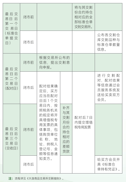 参与每日选择交割的,若采用标准仓单交割,在配对日,卖方提出交割申请的相应标准仓单予以冻结,其卖持仓对应的交易保证金予以清退:交收日闭市后,交易所将卖方交割的标准仓单过户给对应的配对买方,将货款的 80%付给卖方会员,余款在卖方会员提交了增值税专用发票后结清:配对日后7个交易日内,卖方会员应当将增值税专用发票交付买方会员。