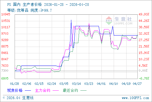 4月28日PX期货主力合约2607收盘价为9838元/吨。
