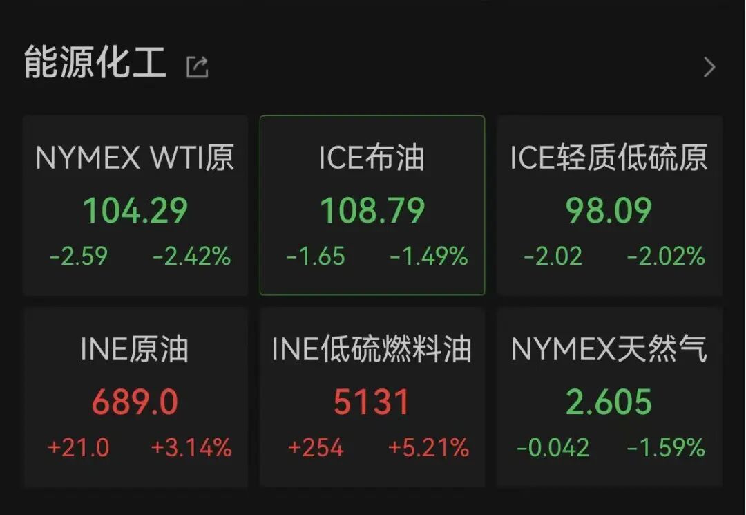 4月30日晚,国际油价直线跳水,由涨转跌。数据显示,截至北京时间20:10,NYMEX WTI原油下跌2.42%,报104.29美元/桶;ICE布油下跌1.49%,报108.79美元/桶。美元指数快速下跌,截至北京时间20:16,下跌0.51%,报98.445。