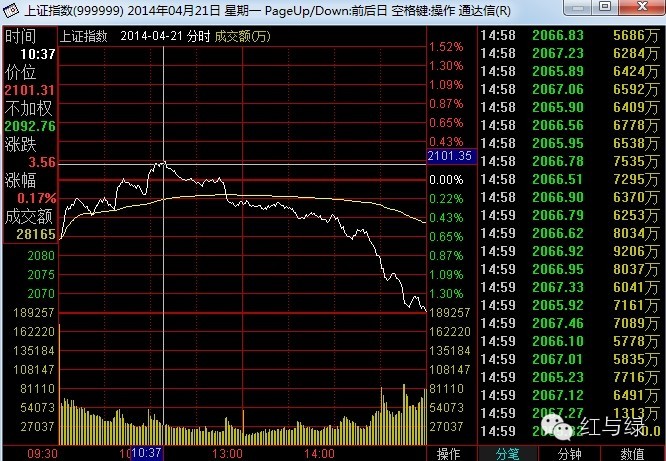 16、今日4月23日上午10:25分左右,李大霄继续高呼牛来,市场随即下跌,巧得很,这个时点又是当日最高点。