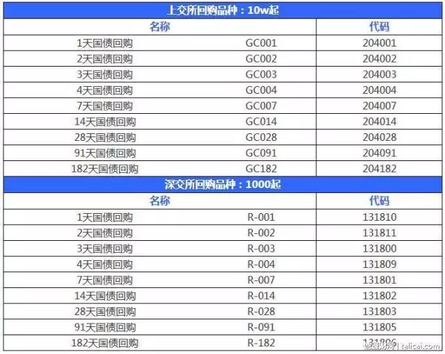 下图为逆回购品种及代码一览