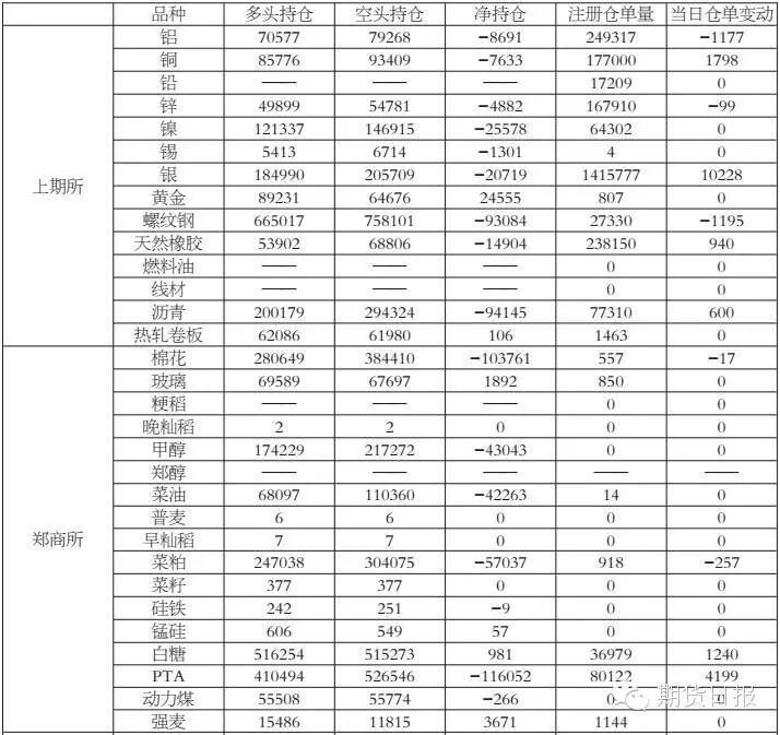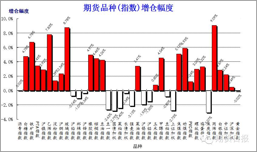 增仓幅度居前的品种是丙烯,9.09%、玻璃, 8.78%、乙烯,7.83%;减仓幅度居前的是焦炭,3.07%、五年国债,2.79%、上证50,2.75%。