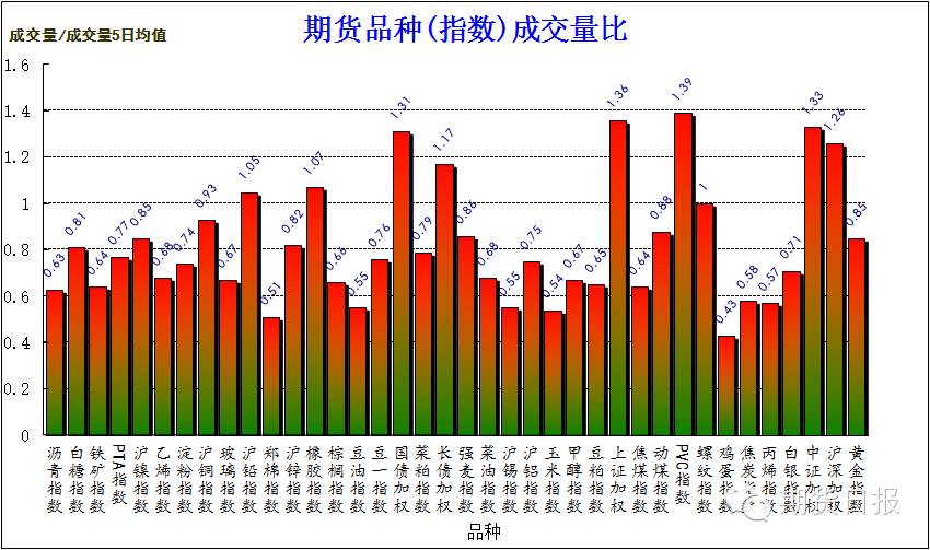 从成交量比来看,比较大的是PVC、上证50、中证500;成交量比较小的是棉花、玉米、鸡蛋。