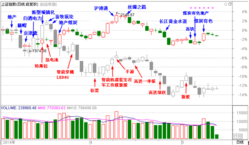 我们来看下最近3个月的差序结构下的事件驱动,图上所标示的都是出现事件驱动后得到资金认可形成板块整体启动的热点。这其中需要通过事件驱动分析和资金强度分析对其做出操作上的筛选。反复强调的是差序结构是判断驱动事件和资金强度的首要因素,由于之前已经明确了小板调整周期股企稳的中期操作策略,那么显然在上方蓝色标示的题材是首先需要关注的热点,而下方红色的新经济题材则是次要的关注点。