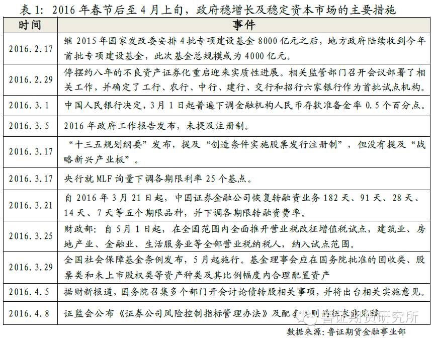 A股期现货市场春节之后的这波上涨,除了节前暴跌后的超跌因素,更为重要的是政策上的呵护。3月初的央行降准、3月中旬的注册制放缓以及战略新兴板搁浅、3月底的社保基金条例发布、4月初的债转股消息以及上周末券商监管新政(意见稿)等消息的发布几乎都出现在A股市场回调甚至反弹有夭折之嫌的关键时点。管中窥豹,可见一斑,政策护盘的意图非常明显。