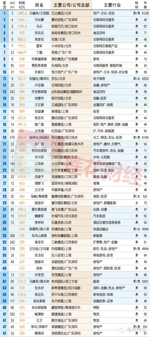 2016年“新财富500富人榜”新鲜出炉了!数据显示,首富再度轮换,王健林第三度登顶。阿里巴巴的马云和腾讯的马化腾则分列二、三位。