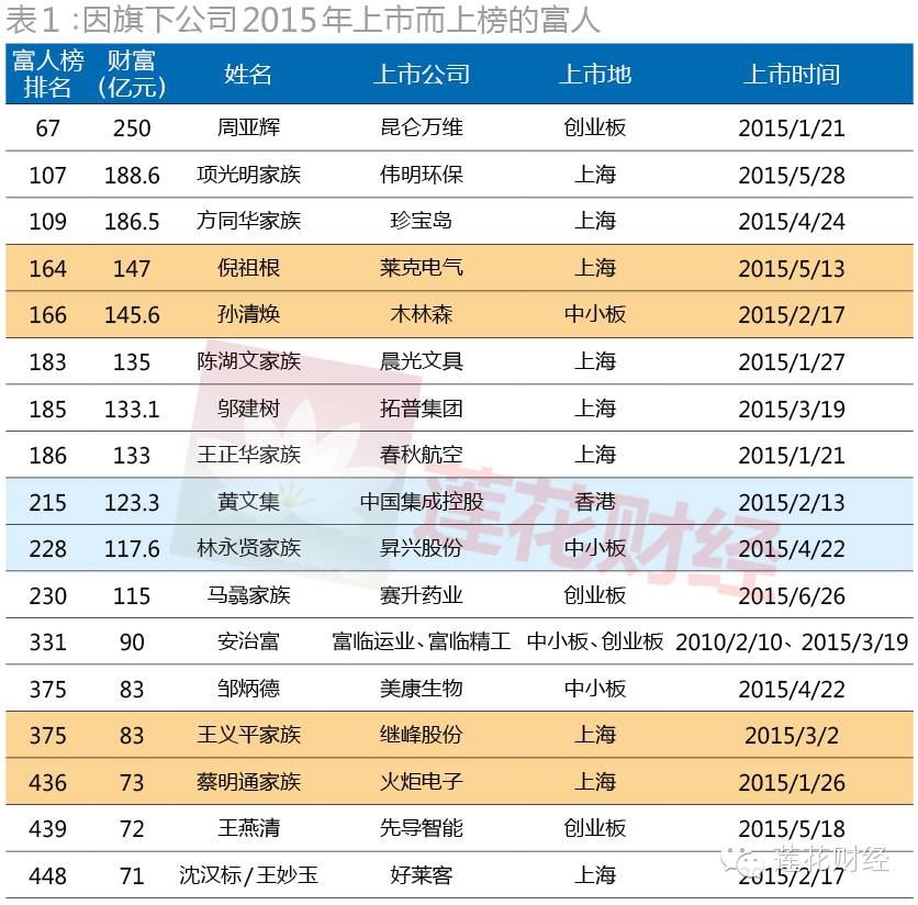 一些早前已经上榜的富人,也由于旗下公司2015年上市而身家倍增。例如,王均金家族因旗下吉祥航空、柯尊洪因旗下康弘药业在A股上市,财富增长分别达到483.3%、344.4%;保利协鑫的朱共山因旗下民用光伏产品板块借壳*ST超日,财富由去年的69亿元大增408.7%至350亿元;许世辉家族更因达利食品登陆港交所,一跃成为福建首富。