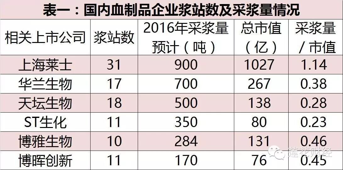 表一总结了国内血制品上市公司的浆站数、采浆量和总市值。一般来讲,采浆量可以侧面展现出公司血制品的生产与销售情况。从采浆量与总市值的对比来看,ST生化和天坛生物比值较低,上海莱士比值最高。