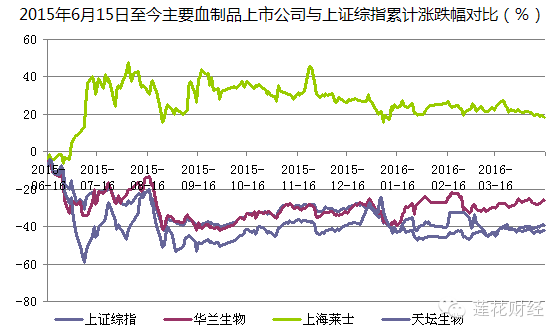 图一直观地展示出血制品上市公司自去年6月15日以来股价表现情况。首先,上海莱士肯定是一大牛股,在大盘深度调整期间,上海莱士不但没跌,反倒累计上涨达20%,最高上涨幅度逾40%。其次,其他两家血制品企业在进入2016年后,均有着不错的表现。