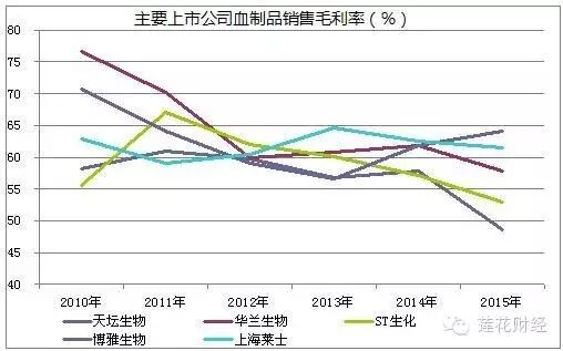 图三则展示了近三年主要血制品上市公司净利润增长率的情况。可以发现,血制品公司的净利润增长率出现了分化走势。上海莱士和博雅生物净利增长率逐年上升,值得一提的是上海莱士近两年增长幅度分别达到了255%和182%。同时,ST生化、华兰生物和天坛生物净利增长率却逐年下降,有一些公司个别年份甚至出现负增长,如2015年天坛生物由于疫苗产业亏损,净利下降明显。