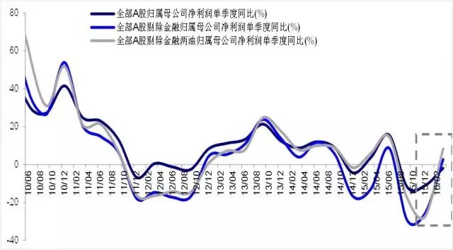 根据海通策略研究团队的统计,A股2843家公司的归属母公司的净利润增速,从2015年三季度同比的-11.8%提升至四季度的-11.1%,再提升至2016年一季度的-1.9%;若剔除金融类上市公司,则一季度的归属母公司的净利润增速已经有负变正,达到2.6%;若再剔除中石油、中石化这两大权重较大的企业,则增速达到8.3%。