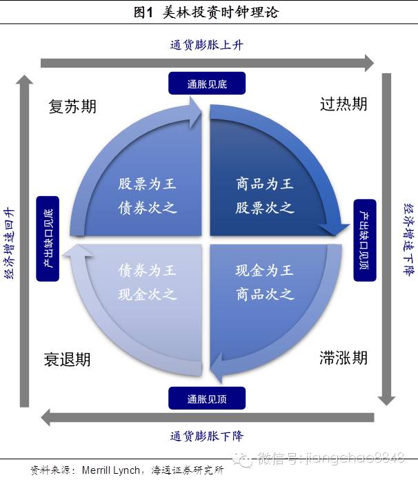 其核心是通过对经济增长和通胀两个指标的分析,将经济周期分为衰退、复苏、过热、滞胀四个阶段,每个阶段对应着表现超过大类的某类资产:债券、股票、大宗商品或现金。