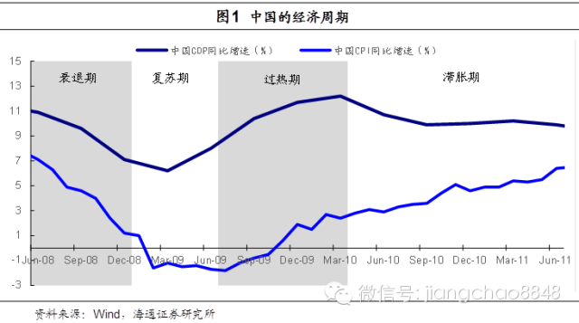 以中国过去几年来看,08年下半年就属于非常典型的衰退期,经济通胀同时大幅下行。受到全球金融危机的影响,我国的GDP增速在两个季度内从10%以上降到了7%左右,经济大幅下行。与此同时我国CPI在08年1季度达到8%以上的高点,随后一路大幅回落,在08年4季度最低降到1%左右。