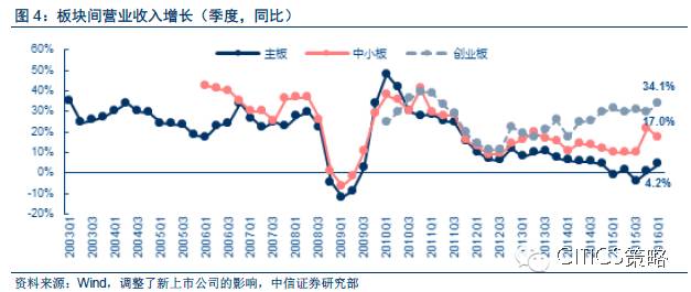 与之前上海战略新兴板类似,中概股回归主要影响如火如荼新兴行业的一级(及一级半市)场。截至4月30日,A股上市公司公布了2016年一季度报告,创业板、中小板的单季盈利同比增速均表现不俗,出现了不同程度的逆周期上扬,分别达到20.4%和41.2%,超出市场预期,外延增长预计仍然是未来一到两年内中小板、创业板以及转型股票净利润增长的最主要来源。相比而言,主板受银行和券商净利润增速放缓影响,一季度同比增长-2.5%,维持负增长趋势。
