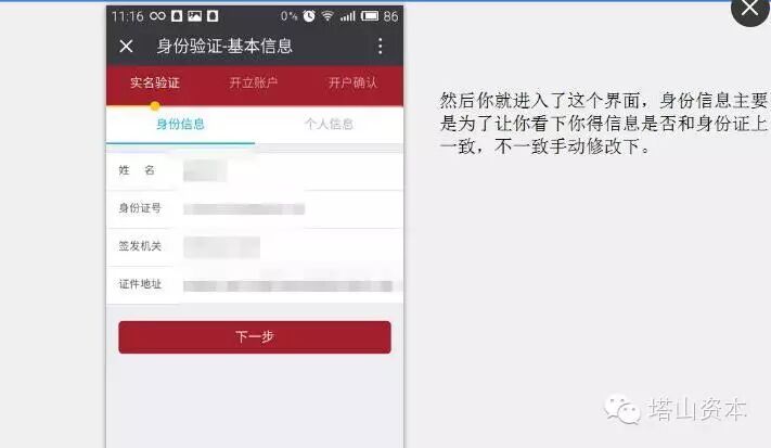 然后用手机拍照上传身份证正反面,然后核对下自动读取的身份证信息,如果错一两个字,自行修改。注意拍摄身份证四个边角都拍摄进去,字体清晰可见,不要切边,如下界面。然后点击下一步: