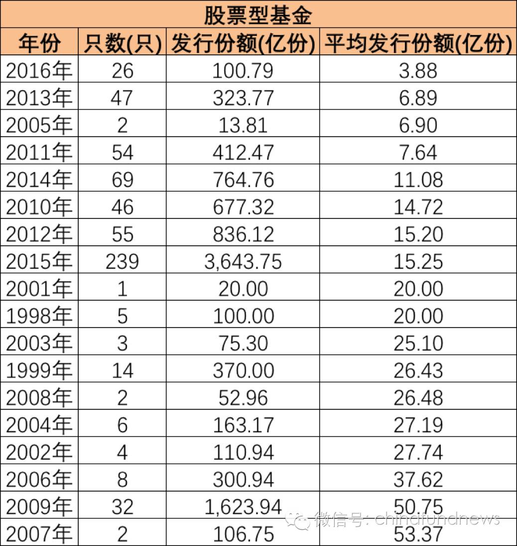 数据显示,此前上证综指跌破1000点的2005年、跌到1849点低点的2013年为股票基金募资最少的两年,但平均单只基金募资仍有6.9亿份和6.89亿份,另一个股票基金年度平均募资较少的年份是2011年,平均单只股票基金募资为7.64亿份。这是过去仅有的股票基金平均募资低于10亿份的3个年份。即使在暴跌熊市的2008年,由于当年仅有2只股票基金成立,期间股票基金平均募资仍有26.48亿份。