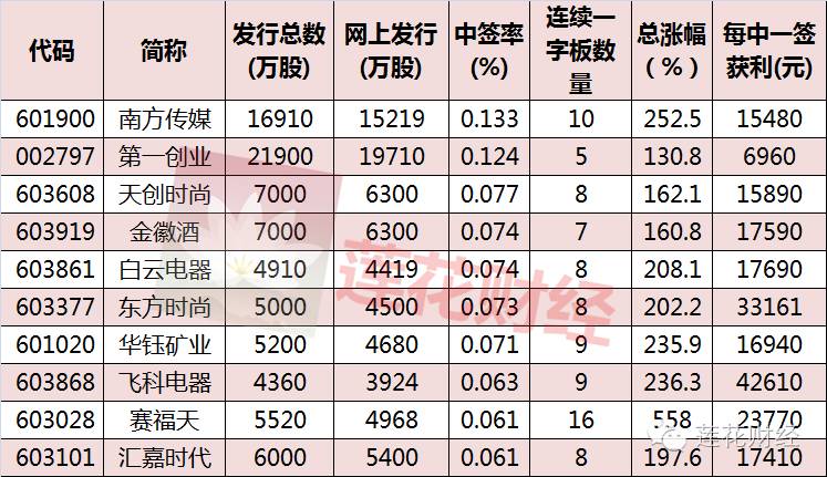 自IPO新规实施以来,沪深两市已完成发行的40余家公司中,发行总数在1亿股以上的公司只有2家,分别为南方传媒(1.69亿股)、第一创业(2.19亿股),两公司的中签率是0.133%、0.124%,分别为IPO新规下中签率第一名及第二名。以下为IPO新规以来中签率排名前10的公司名单:
