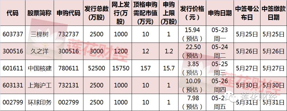 周一至周五,一共5只新股,每天都有新股申购,分别为三棵树(周一)、久之洋(周二)、中国核建(周三)、上海沪工(周四)、环球印务(周五)。