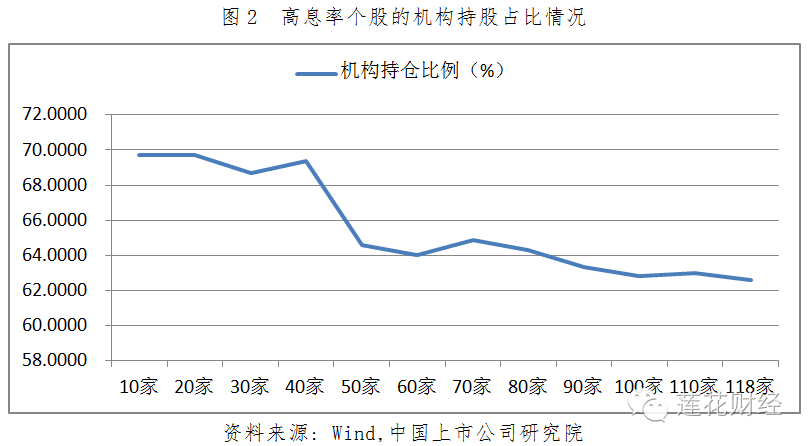 股息率越高,机构投资者占比越大;也就是说,股息率越高,中长线资金越爱。据统计,2011年至2015年,股息率排名前十公司机构持股占比约70%,前118名高股息率公司机构持股占比约62.5%,随着排名数量增加,机构持股占比下降,证明股息率越高,机构投资者越喜欢。机构投资资金在资本市场一般被认为是中长期投资资金的代表。股息暗含着隐形回报,股息越高,中长线资金的隐形回报就越大。详情见图2。